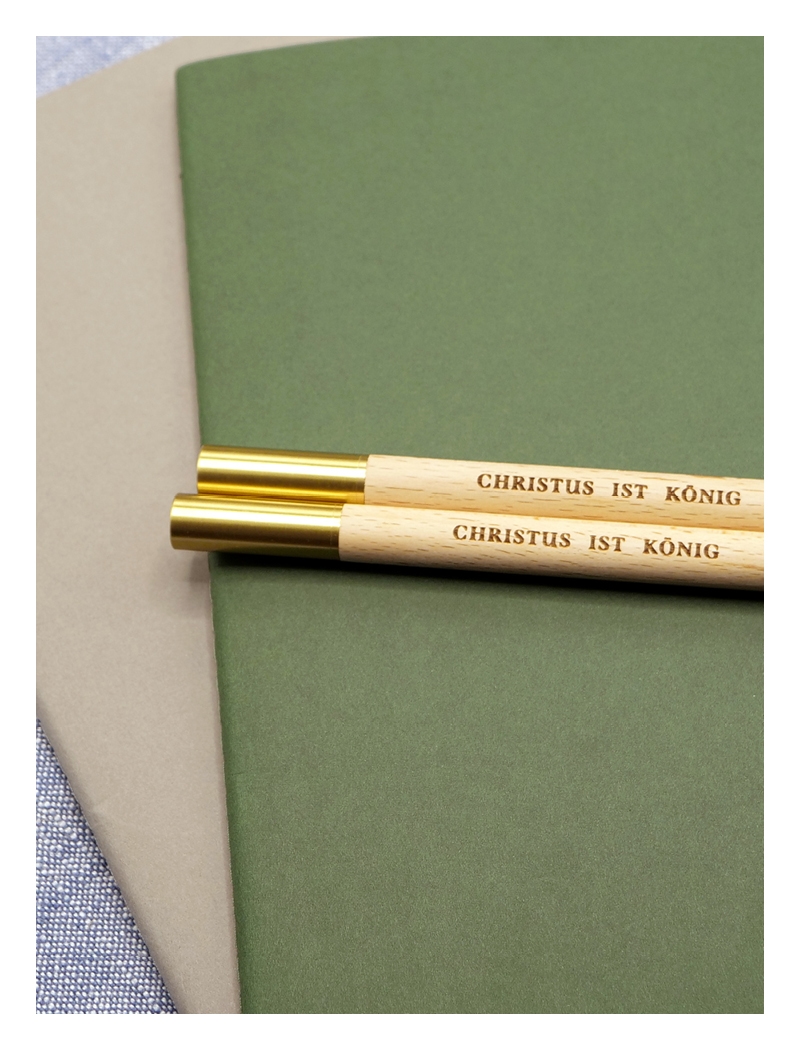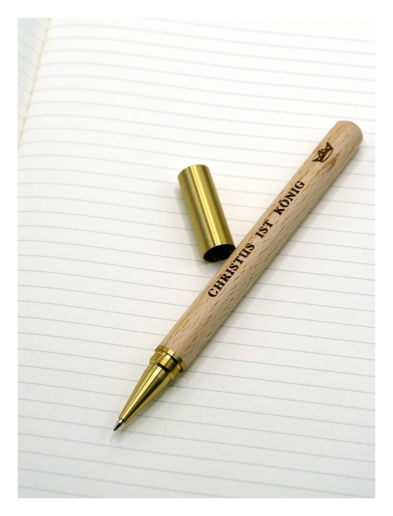 Kugelschreiber aus Buchenholz mit Schraubkappe aus Messing, graviertem PRO REGE-Logo und schwarzer, austauschbarer Gelmine.