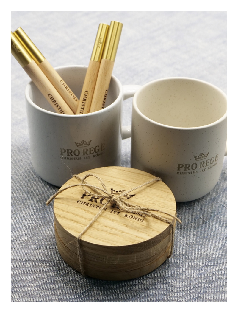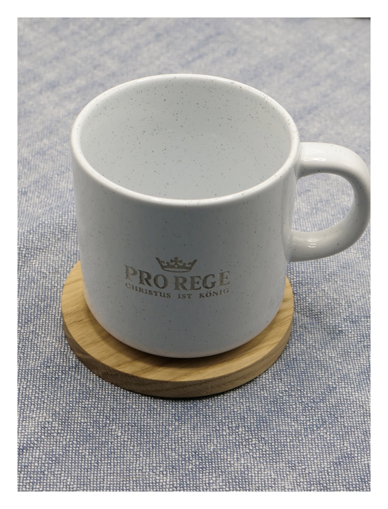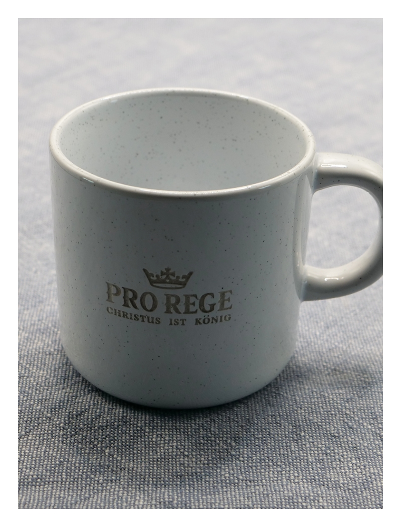 Handgefertigte Tasse aus Steingut mit graviertem PRO REGE – Logo.