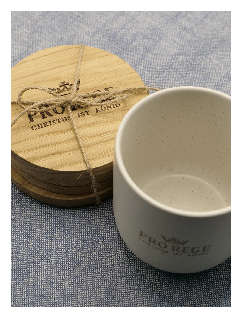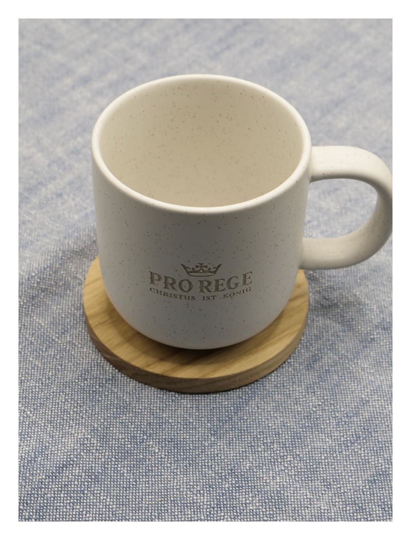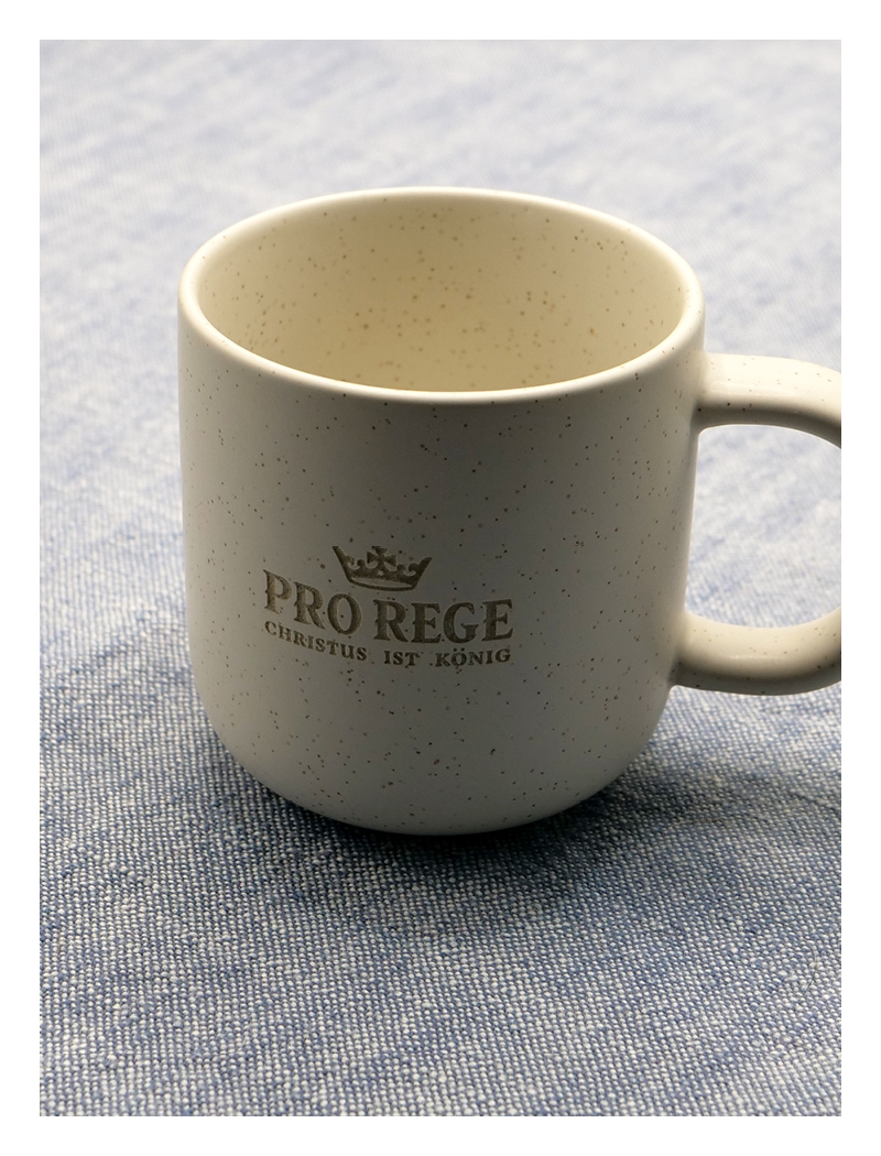 Handgefertigte Tasse aus Steingut mit graviertem PRO REGE – Logo.