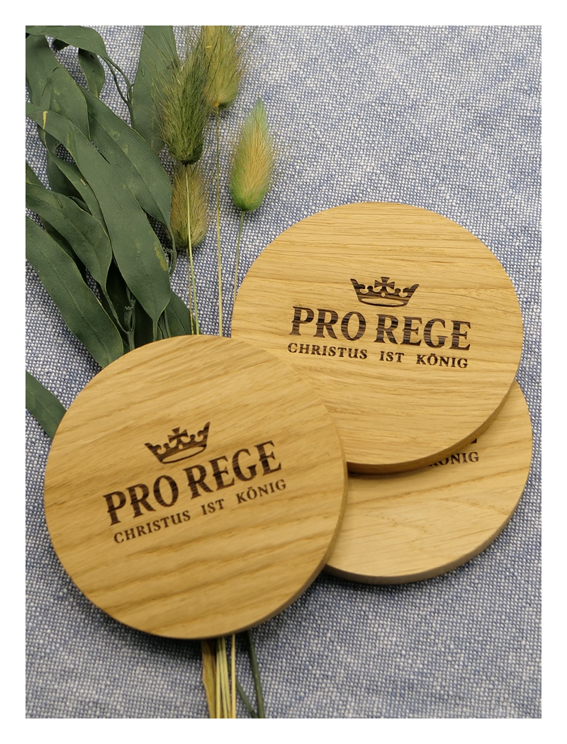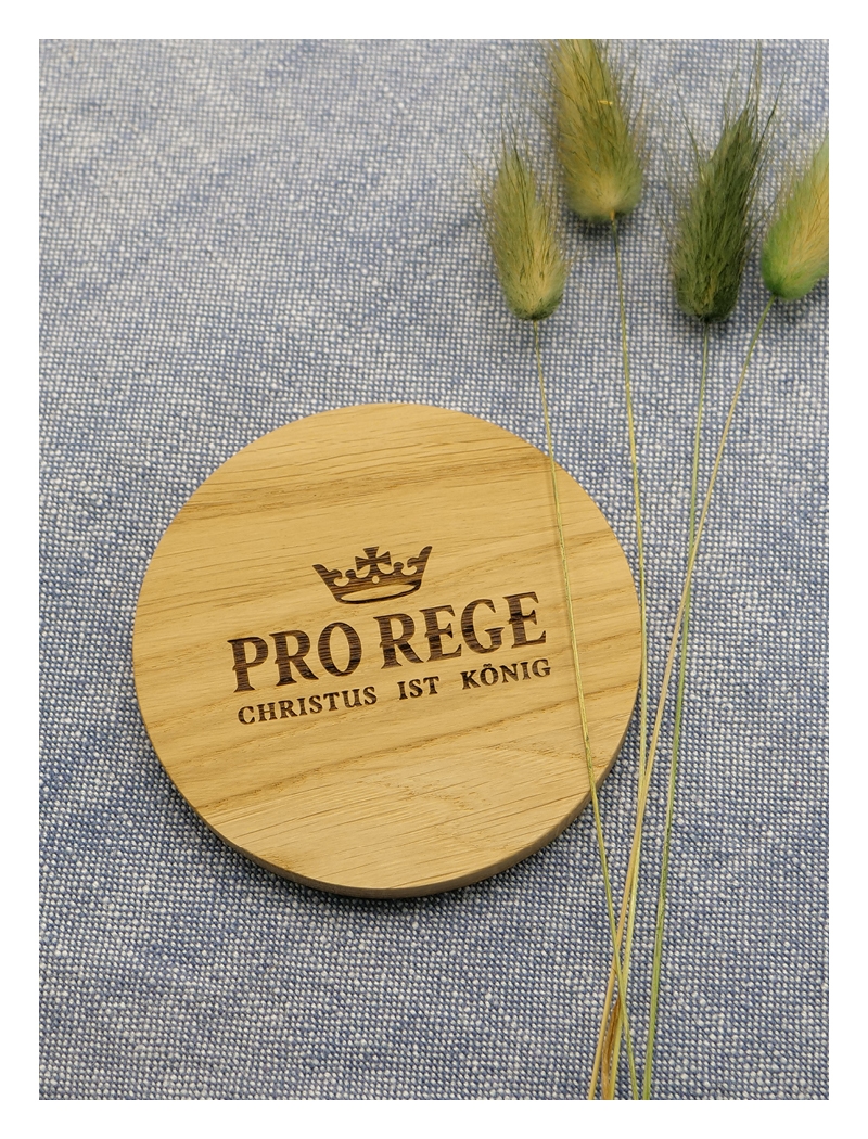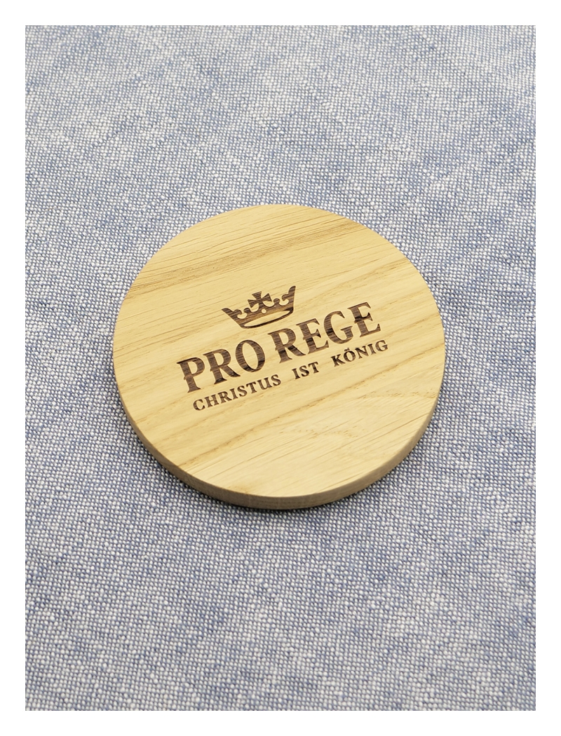 Untersetzer aus massivem Eichenholz mit PRO REGE-Gravur.